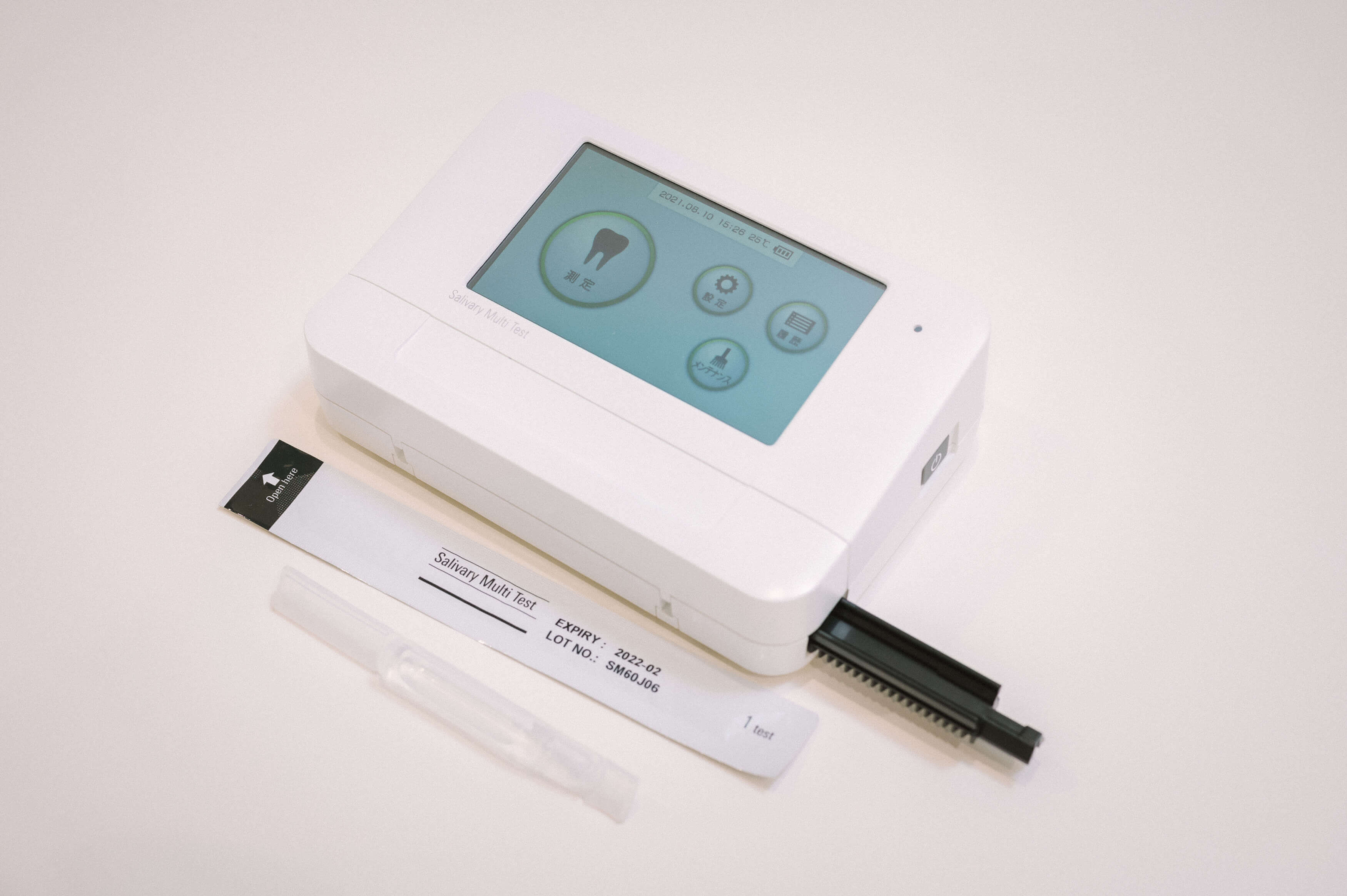 10秒間洗口し、洗口吐出液を試験紙に点着してセットするだけで、お口の健康状態が一目でわかる結果シートが作成される機器です。歯の健康、歯肉の健康、口腔清潔度に関する6項目がチャートで表示されるので、お口の中の状況をすぐにおわかりいただけます。この結果から、患者さまそれぞれに合ったホームケアをご提案します。また、ご自身のお口の健康意識の向上につながります。